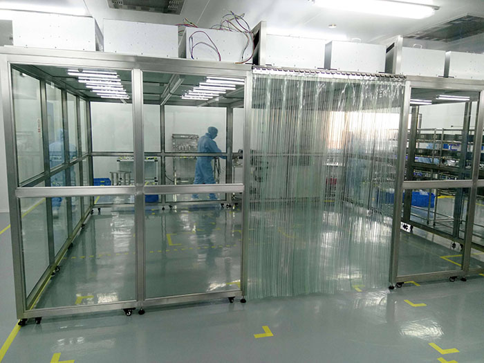 FFU及高效過濾器放置在由放在潔凈棚不銹網(wǎng)支架支撐棚架的托框上。頂部由盲板鋪蓋,密縫嚴(yán)密,四周用防靜電簾圍縫,四周底部利用正壓自然排風(fēng)等形式,使?jié)崈襞飬^(qū)內(nèi)潔凈度達(dá)到1000級(jí)。潔凈棚其具有安裝快速、施工周期短、價(jià)格低廉、移動(dòng)方便等特點(diǎn),,如流水線作業(yè)區(qū)域,高精確度產(chǎn)品組裝區(qū)。
