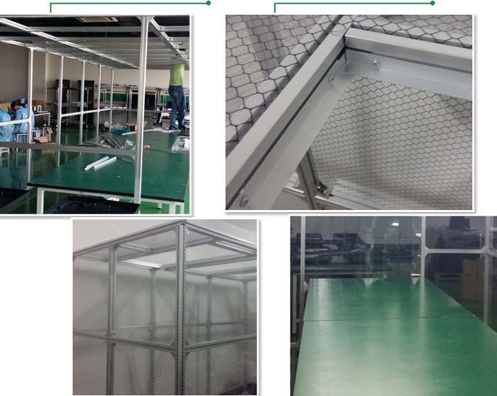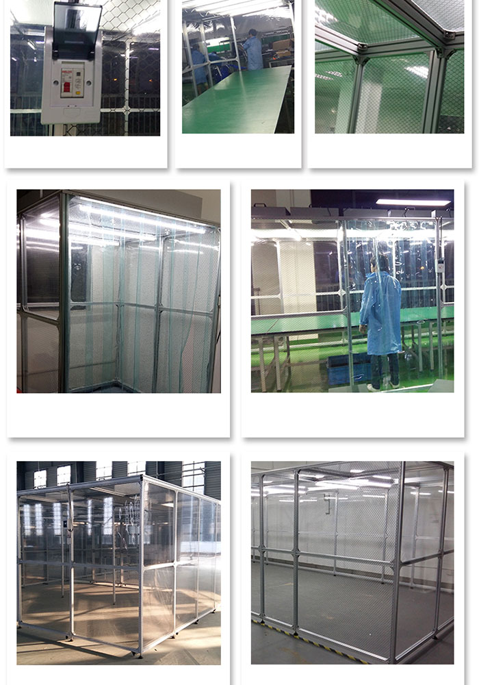 鐵方通烤漆,不銹鋼,陽(yáng)極擠壓鋁管框架,2.0毫米可拆卸防靜電乙烯條FRT門簾乙烯基外殼和0.3mm防靜電窗簾。
