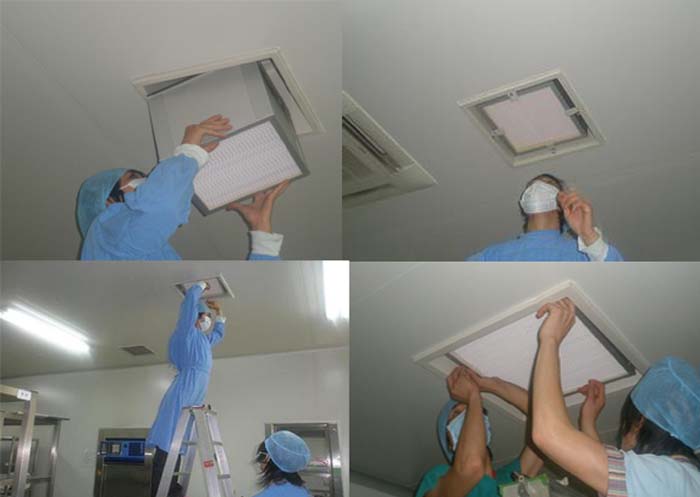 3、高效過濾器拆卸效率蒸汽時,清洗靜壓箱和排氣系統(tǒng)管內(nèi)壁周圍,防止箱內(nèi)腔的銹蝕和吸入粒子等落入效率蒸汽,破壞過濾系統(tǒng)。